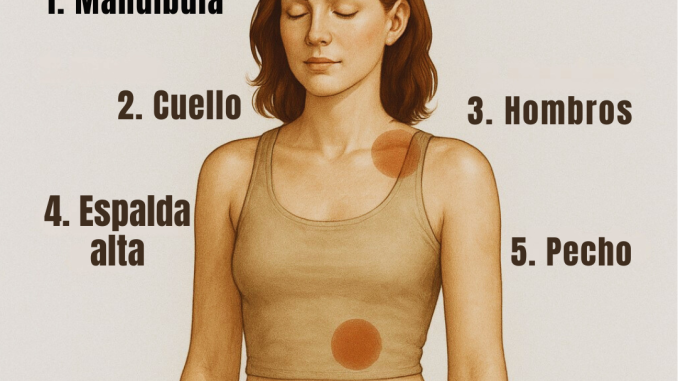 Uno de los lugares más comunes: contracturas en cuello y hombros. El cortisol provoca rigidez y dolor muscular. Unos minutos de estiramiento o yoga diario pueden revertirlo.