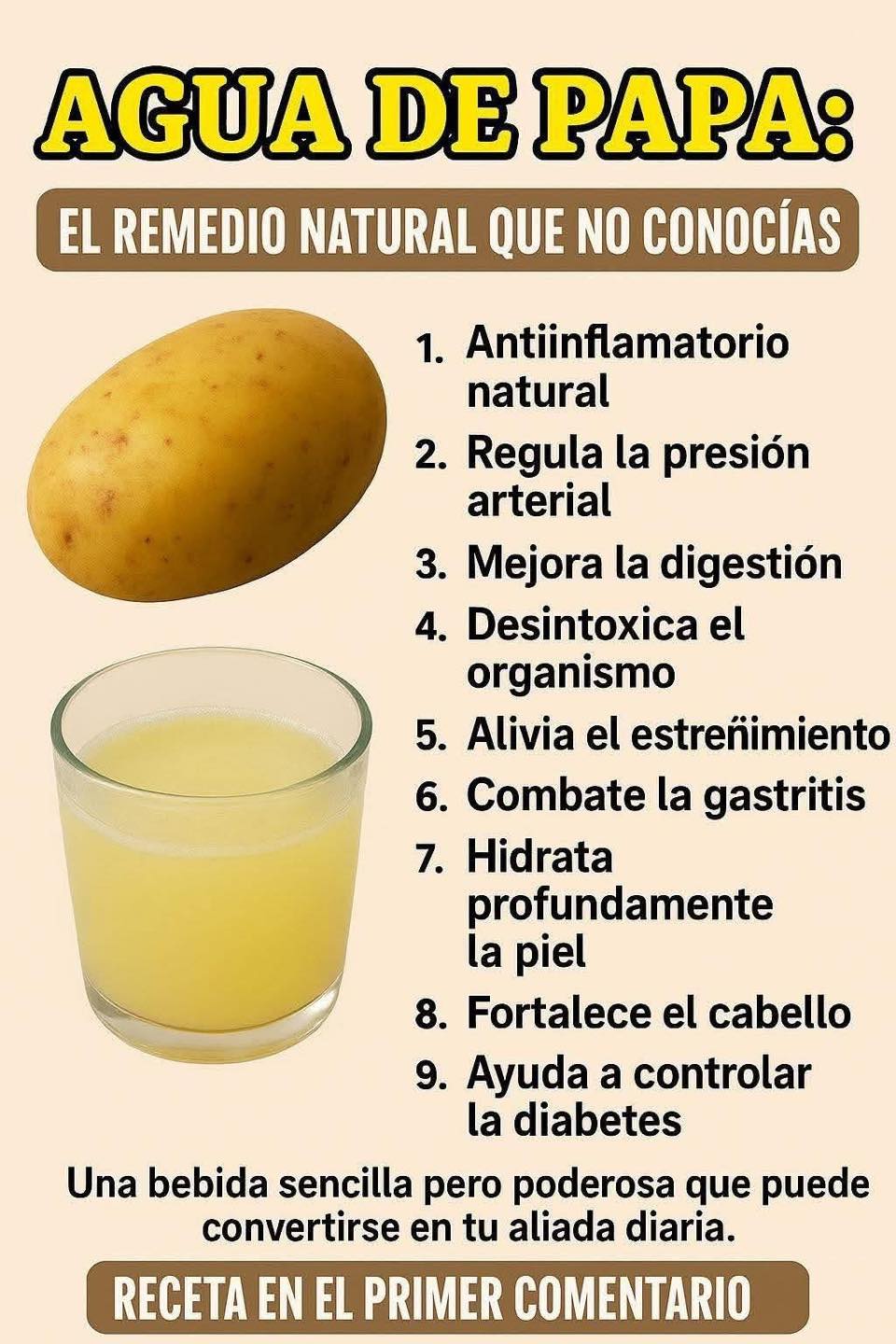 El agua de papa es un remedio natural muy usado en la medicina casera por sus propiedades nutritivas y curativas. Se obtiene al hervir o remojar papas en agua, y concentra parte de sus vitaminas, minerales y antioxidantes. Aquí tienes sus principales beneficios: